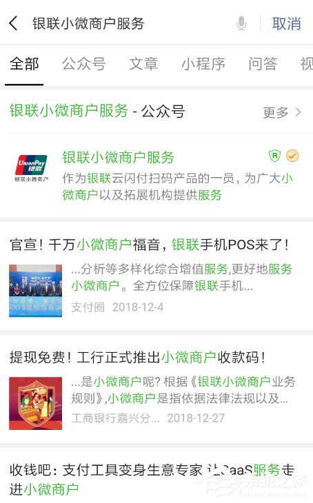 2、以上方式申请的商家收款码没有手续费,但是有着各种限制,比如不能刷信用卡。除此之外,用户还可以通过微信搜索“银联小微商户”公众号申请另一种收款码;