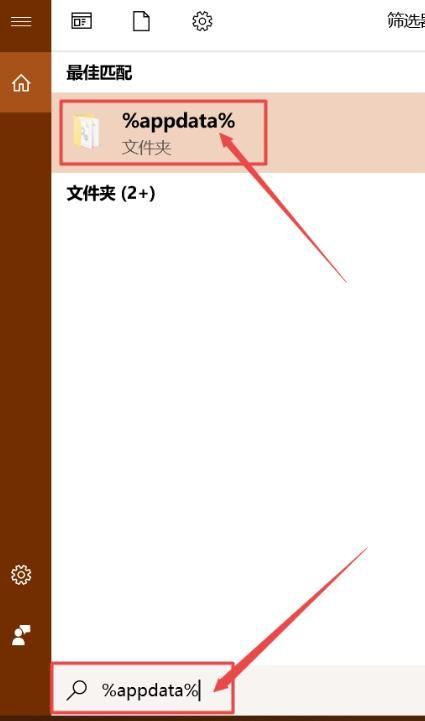 点击主界面左下角的放大镜搜索图标,输入框内输入%appdata%,点击上方最佳匹配的文件夹。