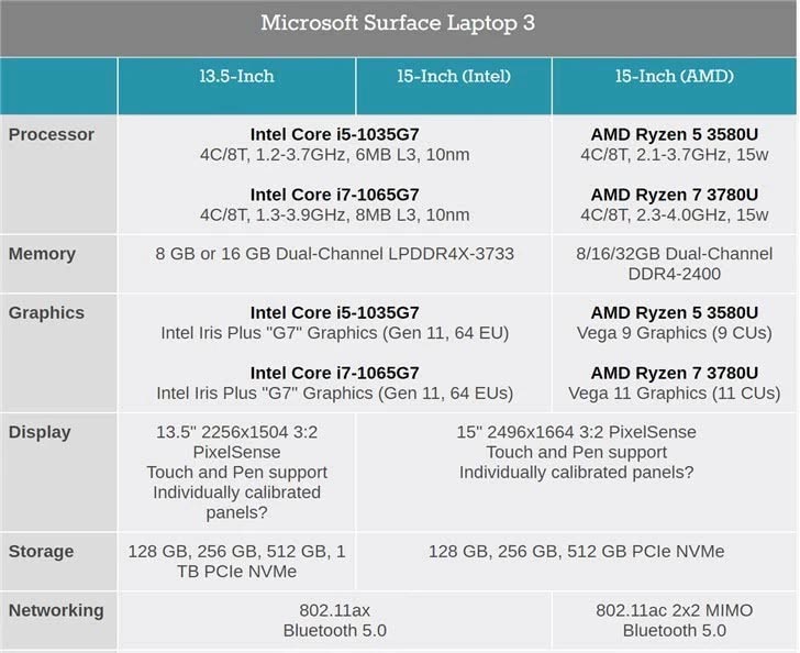 surface laptop 3怎么样10月2日晚上,微软正式发布了Surface Laptop 3笔记本,总体来看可以分为三款:13.5英寸英特尔芯、15英寸英特尔芯和15英寸AMD 芯,现在外媒AnandTech为我们整理了配置一览表,感兴趣的朋友快来了解一下吧。
