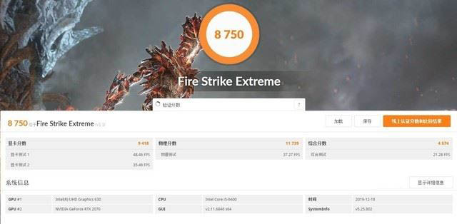 通过3DMark FSE模式测试可以看到,其标准图形性能得分9418分;Time Spy DX12性能部分的图形性能得分为7594分,拥有出色的DX12支持;另外,GeForce RTX 20显卡支持光线追踪,在Port Royal光追测试中,其图形得分为4466分,说明在目前所有光追游戏中,都能在开启光线追踪之后达到流畅游戏表现。
