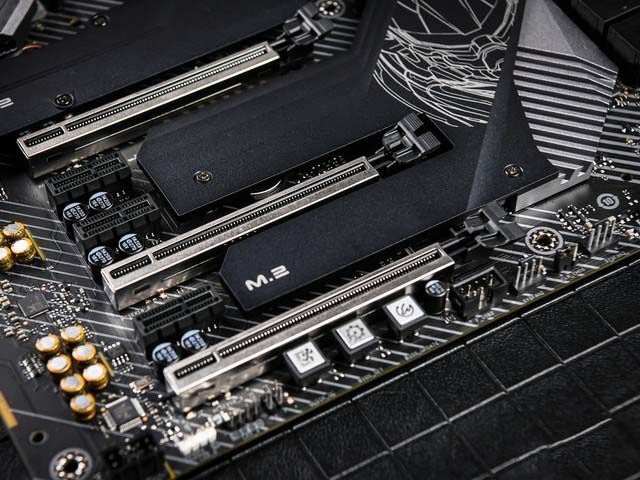 显卡插槽旁边是两个装备了散热装甲的M.2插槽,这些散热装甲为一体压铸成型,看起来质感就很强,本身的强度和硬度也很高。