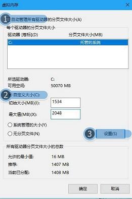 3. 取消勾选【自动管理所有驱动器的分页文件大小】→点击【自定义大小(C)】→【设置】: