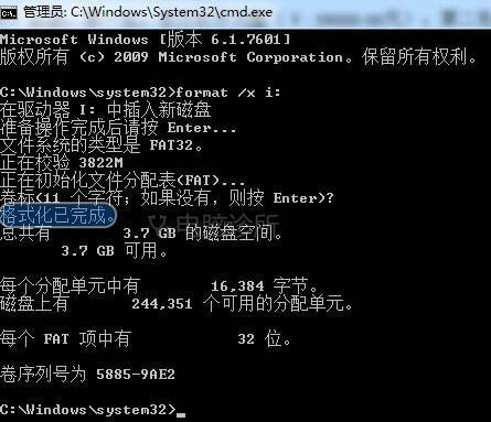 3. 输入“format /x I:”(format /x意思是强制格式化I盘),按键盘【Enter】回车键并等待格式化完成: