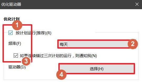 5、在“优化项目”下的“按计划运行”前面的框里打上勾,然后“频率”设置为“每天”或者“每周”,给“如果连续三次计划的运行,通知我”打上勾,后单击下方的“选择”。