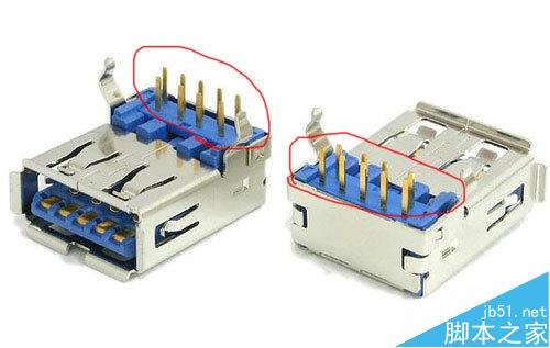 大家注意了USB 2.0只有4pin金属触片,而USB 3.0则有9pin触片,前面4pin与USB 2.0是一样的,USB 3.0的后面有5pin则为USB 3.0专属,要仔细看才看得到,为了直观我找到了下面这张USB3.0的拆解图。