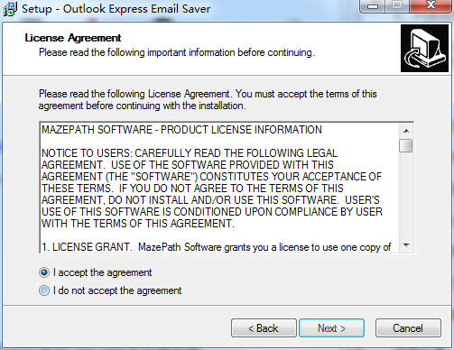 1、在PC下载网将outlook express下载下来,并解压到当前文件夹中,点击其中的4aa270e405f6a63aea6e400c8b8ff434.archiver.exe应用程序,进入安装向导界面,接着点击下一步,来到许可协议界面,我们勾选接受协议后,点击下一步。