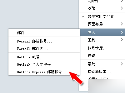 3、在“导入”菜单的下拉菜单中选择“OutlookExpress邮箱账号”。