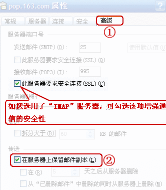 如需在邮箱中保留邮件备份,点击“高级”,勾选“在服务器上保留邮件副本”( 这里勾选的作用是:客户端上收到的邮件会同时备份在邮箱中。),如下图所示: