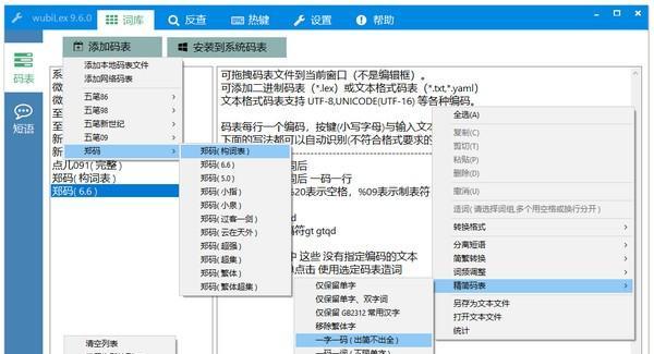 wubiLex 支持导入、导出、安装二进制格式、文本格式的码表, 不需要重启操作系统就可以一键快速切换码表。