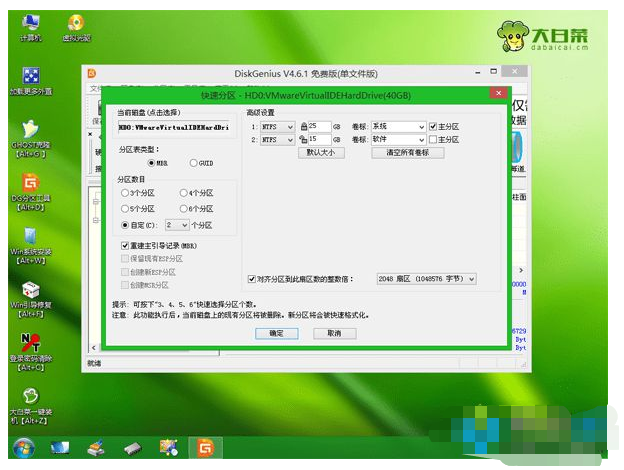 步骤五:设置分区数目和分区的大小,通常C盘建议35G以上,固态硬盘的话,就勾选“对齐分区”即可4k对齐,然后点击确定,执行硬盘分区过程。