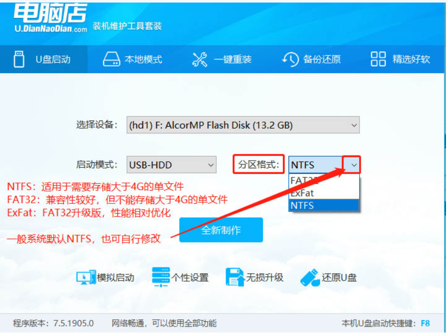 3、设置分区格式时,要注意NTFS格式适用于需要存储大于4G的单文件;而FAT32兼容性较好,只是不能储存待大于4G的单文件;最后的ExFat则是FAT32的升级版,性能相对优化。