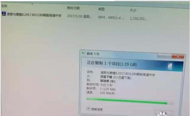 5、下面拷贝大片速度与激情看看传输速度平均是多少。从图片中可以看出平均100MB/S的速度传输,由此可见这款全金属硬盘盒的传输速度相对还是比较稳定的。