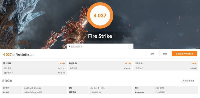 3DMark Fire Strike Extreme以及Fire Strike测试模式下。前者图形分数为2043,后者图形分数为4461。对比满血版MX250独显的话,FSE模式性能提升大概为500分左右,幅度约为22.3%左右;FS模式性能提升大概为1000分左右,幅度大概为21.6%左右。
