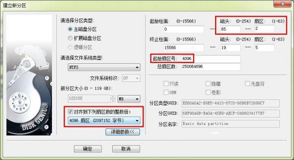 DiskGenius默认建立分区时,占用1+62个扇区,即主引导扇区+保留扇区。4K对齐,就要将分区起始位置建立在默认的保留扇区里。要8扇区数对齐,必须设置为起始柱面0,磁头0,扇区9。
