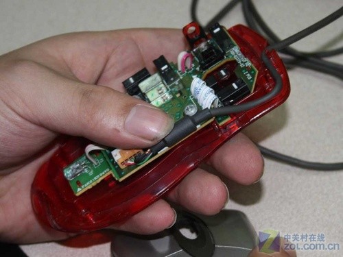 接下来就可以将鼠标的电路板拆出来了,一般电路板的四周会有几个卡子固定电路板,轻轻将卡子翘起就可以将电路板取出。而微软IE3.0鼠标是螺丝钉固定的,有的没有卡子,也没有螺钉固定的,仅仅靠上下外壳来压固的。