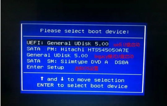 2、这时候就会来到启动项选择菜单了,找到u盘启动项,比如图中的General UDisk表示u盘,一般是显示U盘的名称,比如Toshiba、Kingston、Sandisk等带,有UEFI的是uefi模式的启动U盘项,不带uefi的是legacy模式的U盘启动项。选择好U盘启动项,按回车键即可进入U盘启动。如果没有看到U盘,则选择Enter Setup进BIOS设置,具体看方法二。